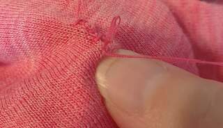 2. Steek de naald zo’n 5 tot 10 mm aan de bovenkant van het gaatje af door de ‘gezonde’ stof aan de binnenkant van het kledingstuk. Doe dit in de richting waar je op wilt naaien. De naald komt tevoorschijn aan de buitenkant van het kledingstuk.