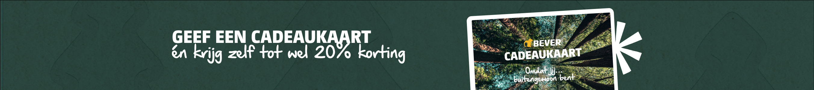 Ben jij op zoek naar een cadeau voor een echte buitenliefhebber, kies dan voor de Bever digitale cadeaubon of de Bever cadeaukaart. Zo kan de ontvanger zelf een mooi cadeau uitzoeken en weet je zeker dat het niet ongebruikt in de kast belandt. Met ons ruime assortiment van leuke gadgets, sokken, sloffen, handschoenen en tal van andere outdoorkleding en -gear, zit er altijd een voltreffer tussen voor het volgende buitenavontuur!